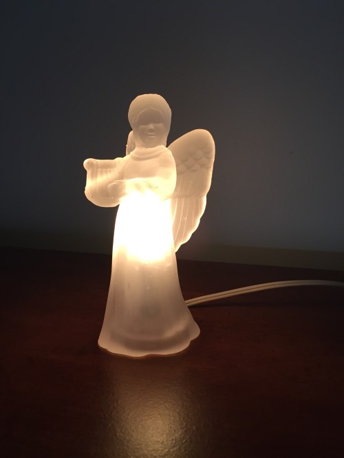 But the Christmas tree takes up more room than a small nativity scene, so I ran out of excuses this week-end and Keith and I took off the lights, dismantled the tree and hauled everything to the attic.  The den seemed awfully dark without the glow from the tree, so I dug out an angel light that had belonged to my mother-in-law and plugged it in on the bookshelf. She gave out just enough  to brighten up the corner of the room.