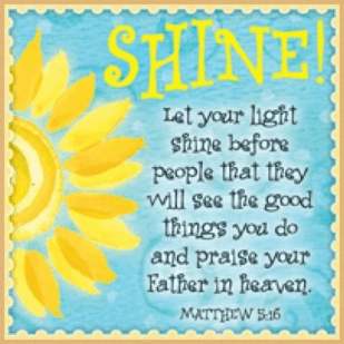 “You are the light of the world. A town built on a hill cannot be hidden. 15 Neither do people light a lamp and put it under a bowl. Instead they put it on its stand, and it gives light to everyone in the house. 16 In the same way, let your light shine before others, that they may see your good deeds and glorify your Father in heaven.” Matthew 5:14-16