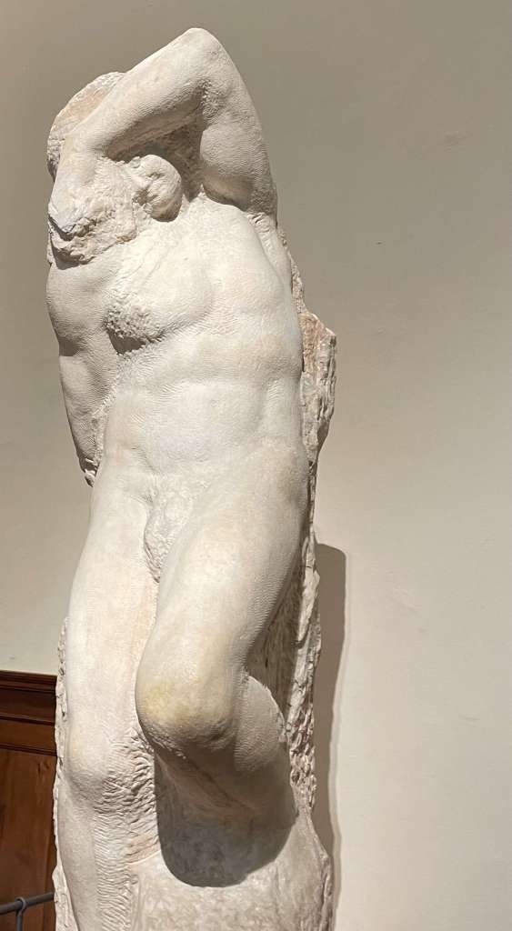 Lining the long corridor leading up to David are what to me are the most fascinating of Michelangelo’s sculptures. These are his unfinished works known as the prisoners or slaves. The figures, seen mostly as torsos, seem to be trying to heave themselves out of the rock, as if they are imprisoned there. Art historians have studied them for centuries and they shed light on Michelangelo’s technique for sculpting.