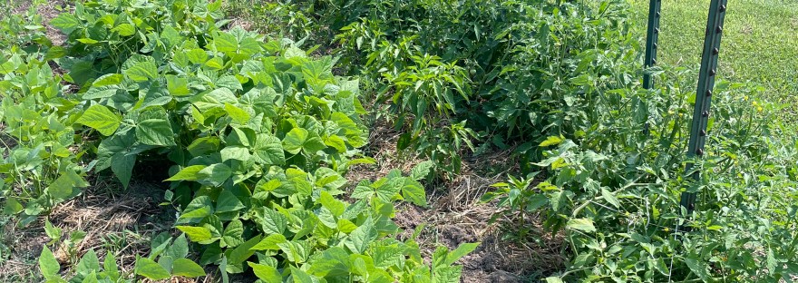 The cucumber vines are full of yellow flowers but no little cukes yet, a few green tomatoes are showing promise, and I pulled one small pepper from the vine to eat with our supper. Squash is coming in slowly.