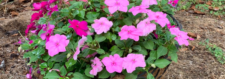 I have a basket that I picked up for a dollar at a flea market and each summer I fill it with moss and plant flowers in it. This year I had an overabundance of purple, pink and blue impatiens so I planted them in the basket and put it in my flower garden in… Continue reading Withering in the Sun